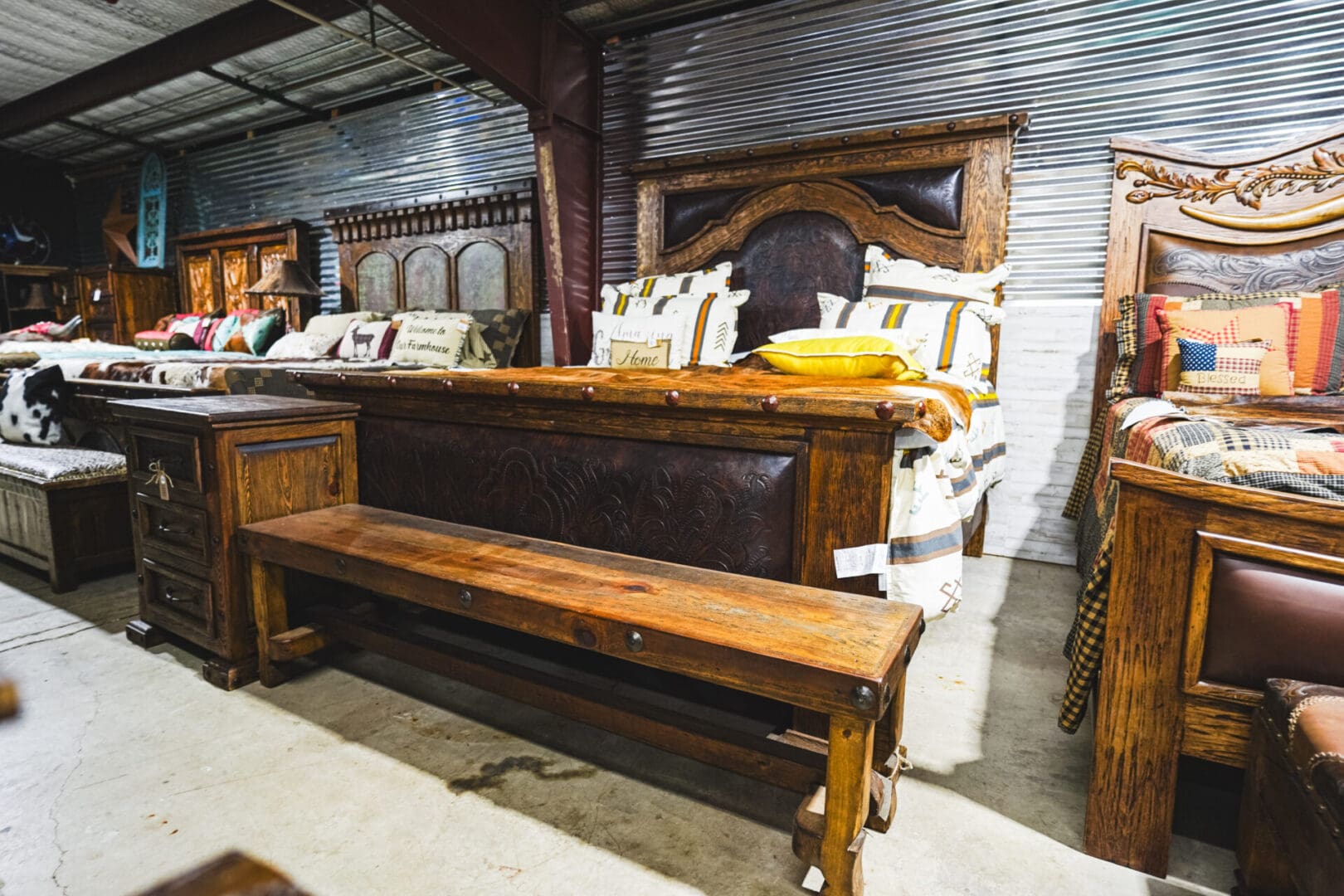 Comes in Queen and King size. Enhance your home with this beautiful one of a kind bed. Built to perfection with custom hand leather tooled this is one of the many type of Beds we can custom build you here at The Vault.